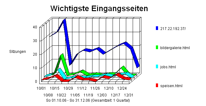 Dieser Abschnitt zeigt den ersten Hit eines Besuchers auf dieser Site. Dies ist im allgemeinen die Homepage, kann aber manchmal auch eine bestimmte URL-Adresse sein, die der Anwender eingibt, um direkt zu einer bestimmten Seite zu gelangen. Die Prozente beziehen sich auf die Gesamtzahl der Anwendersitzungen.
