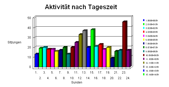 Diese Abschnitt zeigt die aktivste und die inaktivste Tageszeit während der Berichtszeitspanne. In der zweiten Tabelle sind die Aktivitäten aufgeteilt, um die Aktivität während der einzelnen Stunden aufzulisten (wenn die Bereichtszeitspanne mehrere Tage umfaßt, entspricht die Zahl der Summe aller Hits während der gegebenen Tageszeit). Sämtliche Uhrzeiten beziehen sich auf den Ort des Systems, auf dem die Analyse ausgeführt wird.